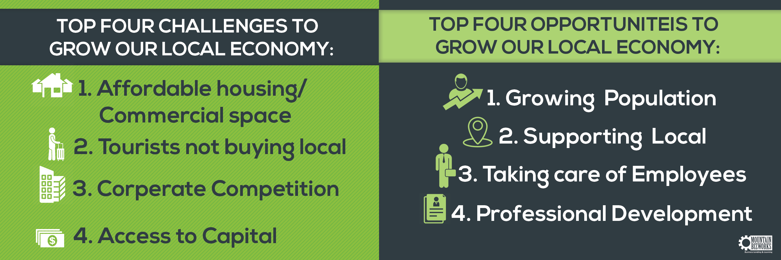 What are entrepreneurs saying about the WNC economy? Local small business owners report the region is growing with strong support of local. They would like to see a continuation of sourcing local, taking care of employees, and more professional development opportunities. Challenges they saw revolved around affordable housing, tourists not buying local, corporate competition, and access to capital.