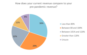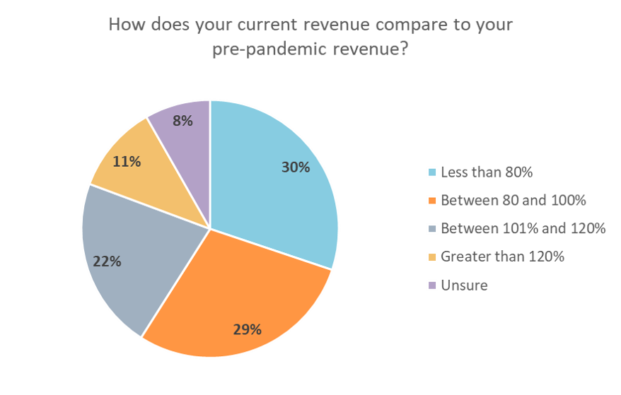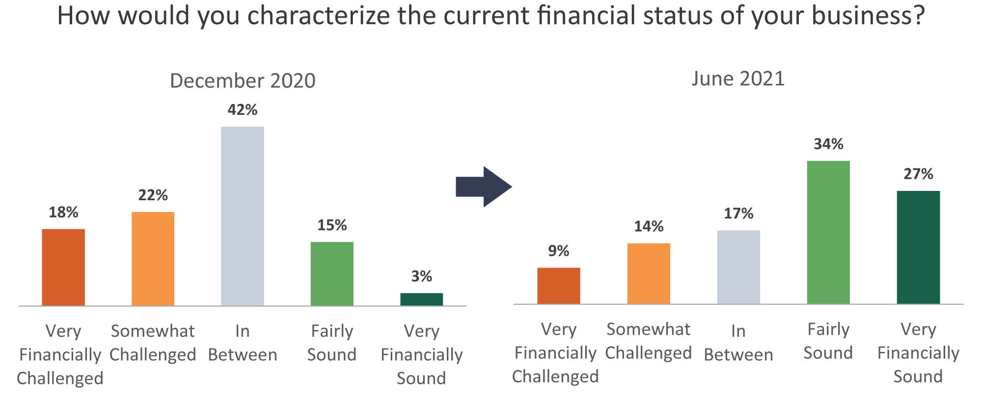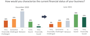 The survey shows that only one-third of businesses have recovered to pre-pandemic revenue levels, however businesses’ outlook has significantly improved in recent months, to the extent that 60% of respondents rated their financial health as ‘fairly sound’ or ‘very sound’ (up from only 18% in December 2020). In general, this suggests that many business owners have regained a sense of stability and see a path to recovery, even if they aren’t all the way there yet. At the same time, the data also points to some pockets of ongoing distress that we should be aware of and consider in ongoing relief efforts.