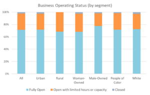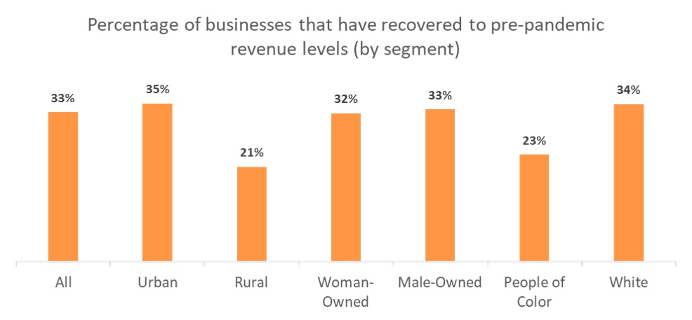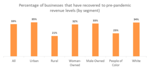 The below chart highlights variations in business revenue recovery levels by segment. It’s clear that rural-based businesses and businesses owned by people of color are recovering at a slower pace.