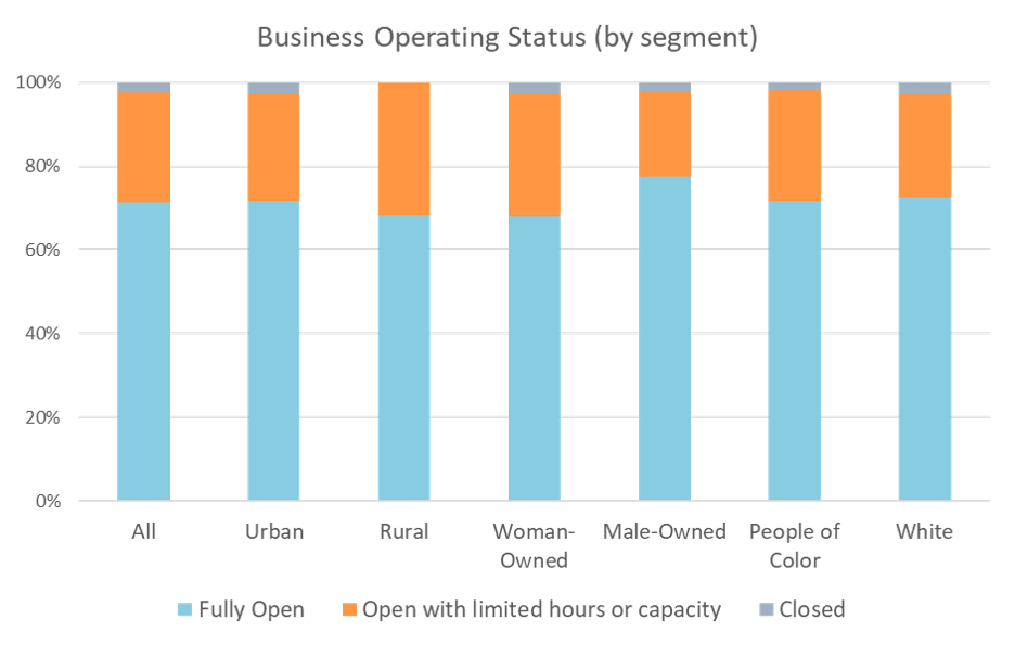 72% of businesses reported being fully open, 26% were open with limited hours or capacity, and 2% were closed (note: we expect the survey participation rate would be low among closed businesses). Notably, women-owned businesses are 10% less likely to be fully open than their male-owned counterparts.