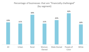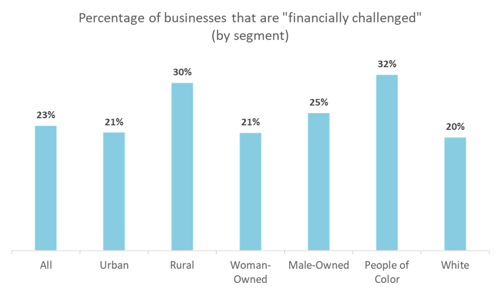 Similarly, rural businesses and those owned by people of color were also more likely to rate their financial health as “challenged” or “very challenged”.