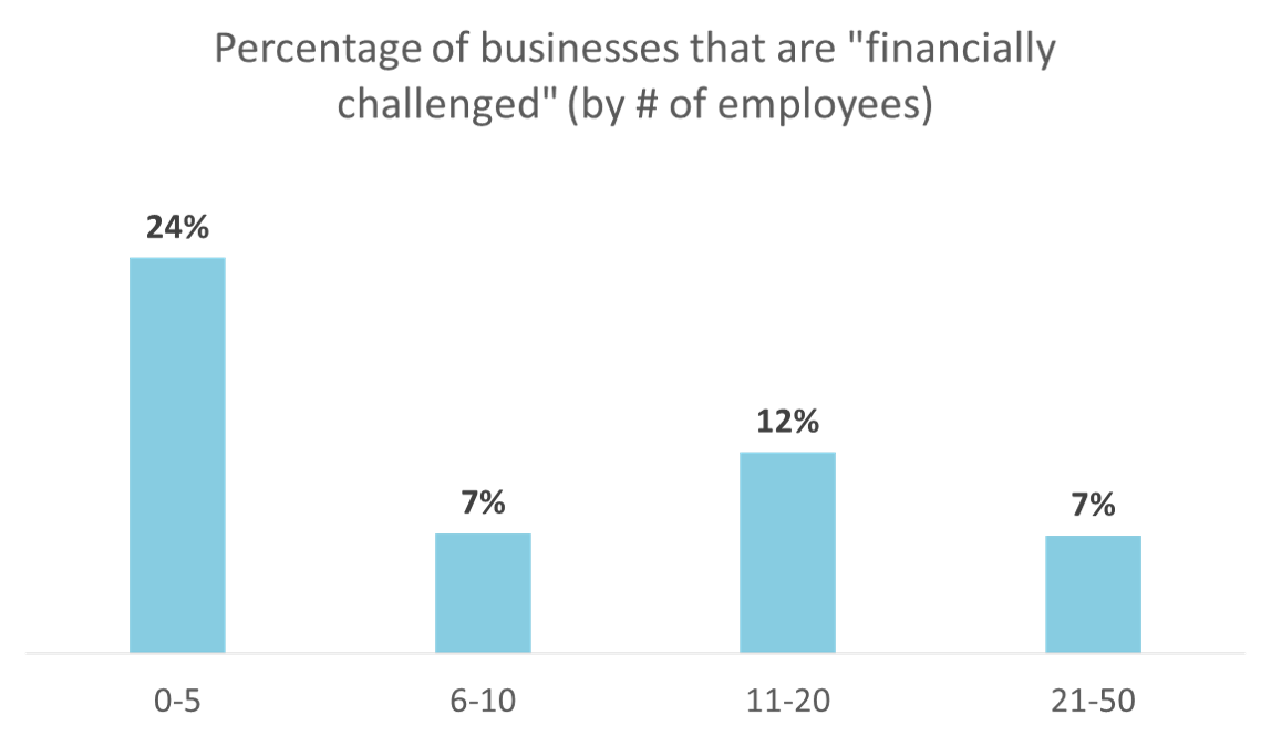 Business size (number of employees) also has a strong impact on business outlook. One quarter of businesses with 5 or fewer employees rated themselves as financially challenged, double the rate of the next closest size classification.