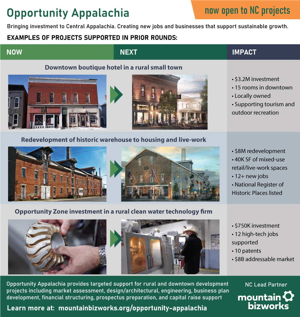 As the lead partner in North Carolina, Mountain BizWorks invites all interested community and economic development leaders, local elected officials, developers, and business owners to learn about the opportunity to obtain technical assistance for important development projects to move your community forward.