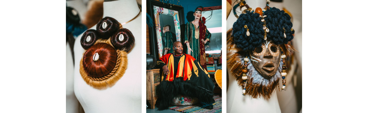 Now, her basement studio is filled with art: mannequin figures wearing beautiful, one-of-a-kind statement neckpieces. She utilizes materials that speak to her: a bead set she finds thrifting, Ankara fabric, traditional African masks, denim, decorated gourds, or various colors and styles of hair, and more. Each component tells a story.