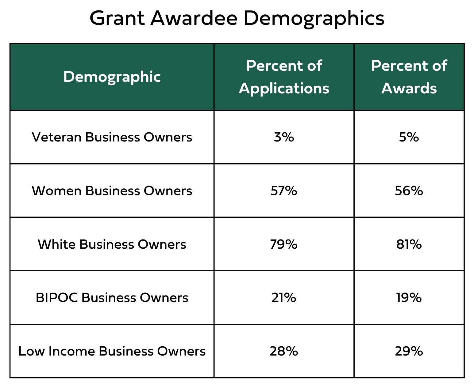 In alignment with the selection criteria listed above, the strategy ensured funds were awarded to businesses that had the most impact and least ability to recover without additional support. The awardee pool closely mirrors the demographic makeup and geographic distribution of applicants, and also reflects the program’s focus on Historically Underutilized Businesses, including those owned by veterans, women, people of color, and low-to-moderate income individuals.