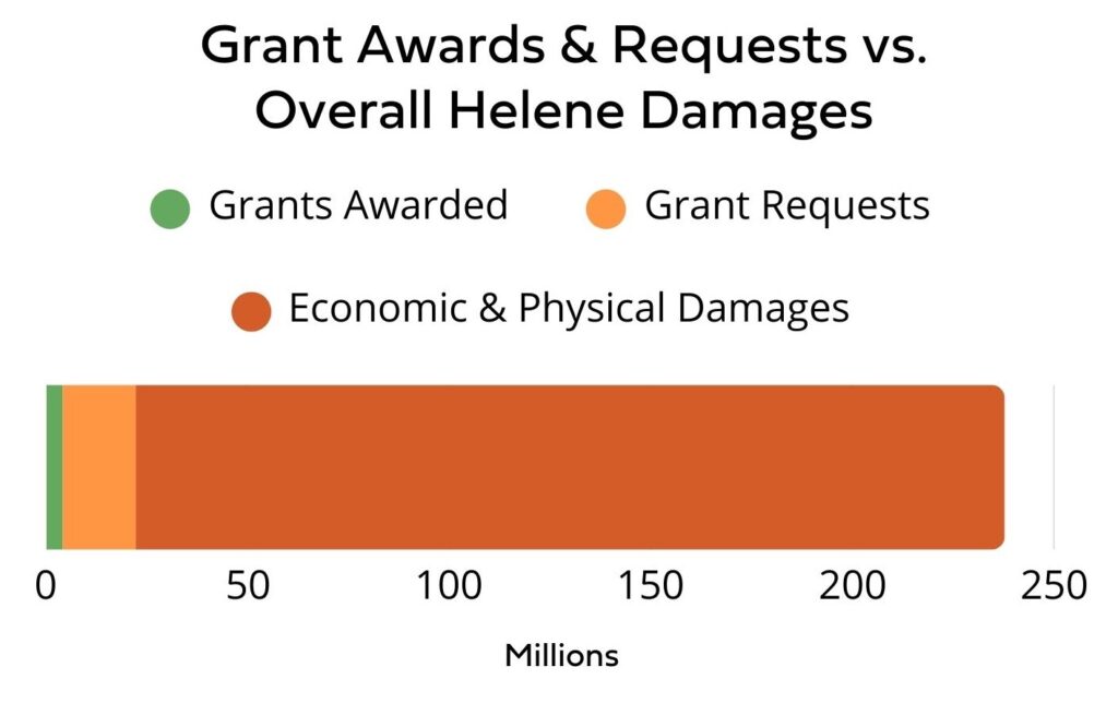 Applicants reported total economic damages of $139.9 million and physical damages of $75.7 million, totaling $215.6 million from 844 submissions. Of that, the program awarded $4,447,395 million in grant funding this round. This leaves $211 million in unmet small business impacts and 454 small business applicants without an award at this time. The chart below illustrates the current level of grants (green) and scale of the overall Helene-caused business losses (dark orange).