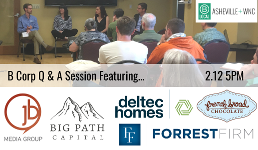 Join Jael Rattigan of French Broad Chocolates, Michael Whelchel of Big Path Capital, and Adrianne Gordon of JB Media, for an information and Q&A session on the process of becoming a certified B Corp moderated by Martha Bradley of Forest Firm.